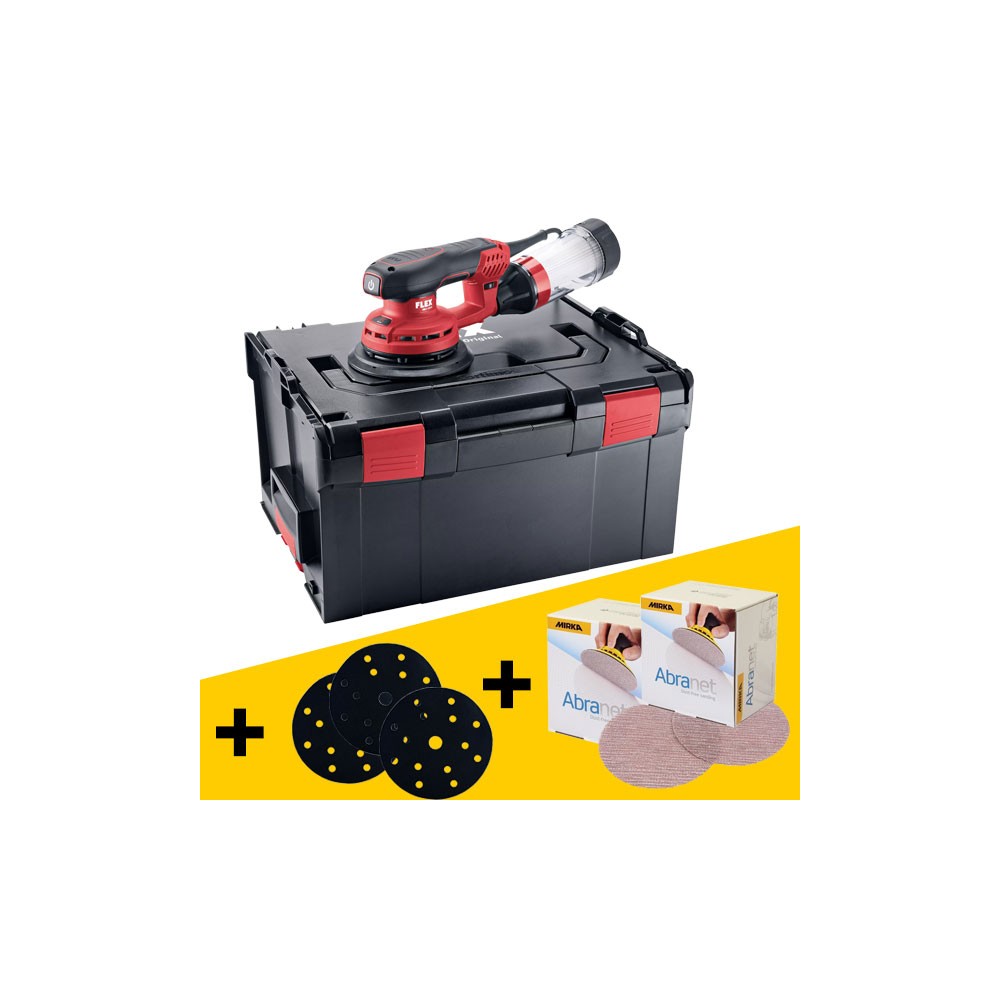 Pack ponceuse electrique excentrique avec régulation de régime 150 mm Flex ORE 5-150 EC Set en coffret L-Boxx + 100 disques Abranet (P80 et P120) et 3 protecteurs de plateau FLEX.